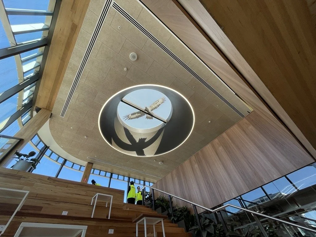 The campus weaves connection to Country throughout. Spatial relationships, textures and colours evoke elements of Country, including the ridges of nearby Brinbabella ranges and their flora, the Yankee Hat Rock Art site, local river networks, and Sky Country. The facade design represents 'walking the ridgeline’. Interiors use colour coding on each level to mimic a journey from Deep Country to Sky Country, providing a calm atmosphere and assisting with wayfinding. On the top level, an oculus features the silhouette of a mulleun (wedge-tailed eagle).